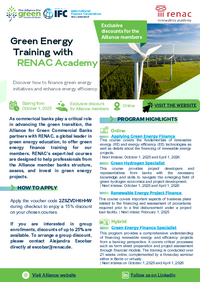As commercial banks take on a pivotal role in driving the green transition, equipping financial professionals with the right knowledge and skills is essential. The Alliance for Green Commercial Banks partners with Renewables Academy AG (RENAC), a global leader in green energy education, to provide specialized training programs that empower commercial banks to structure, assess, and invest in sustainable energy projects.